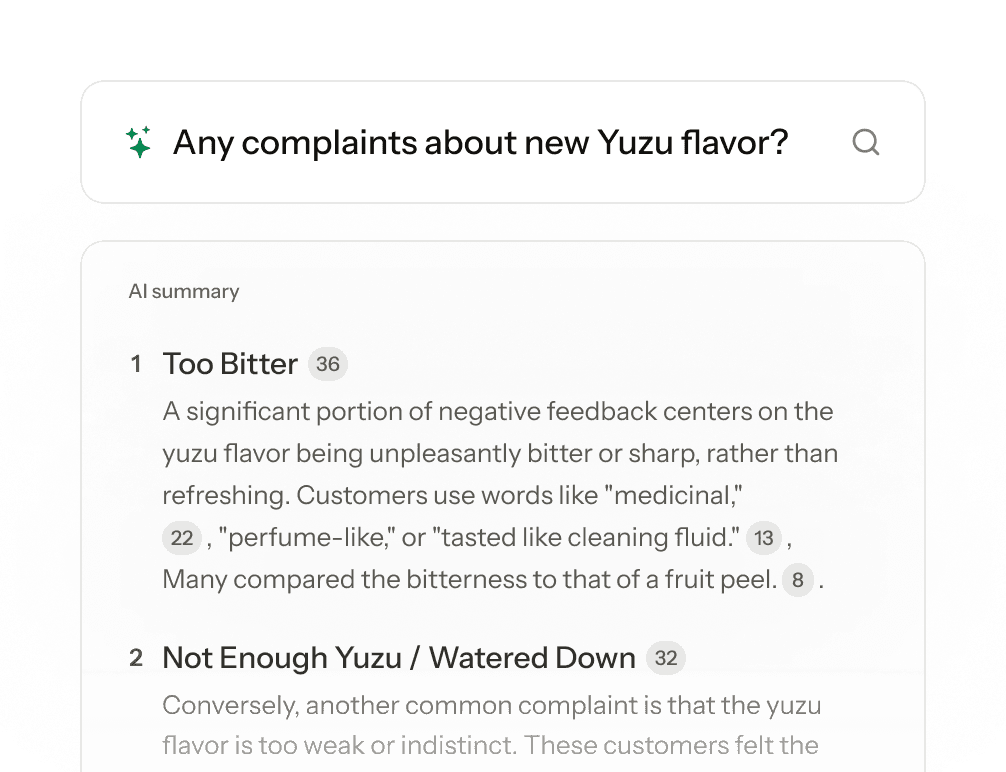 Navigate through customer feedback at the speed of thought. Go beyond keyword searches and uncover the hidden opportunities to accelerate your brand's growth.