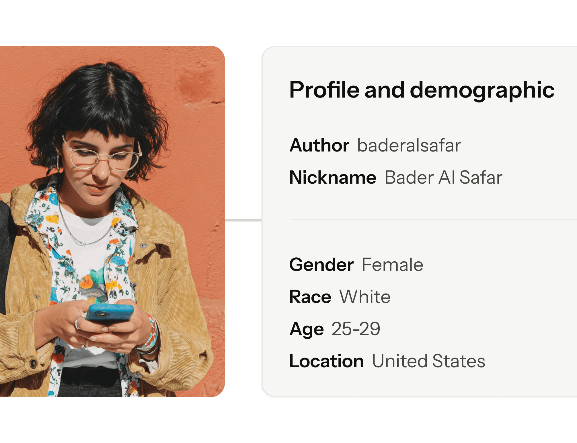 Creator Profiling: Automatically estimate the age range, gender, and ethnicity of the creators starring in videos to ensure your marketing is resonating with your target personas.