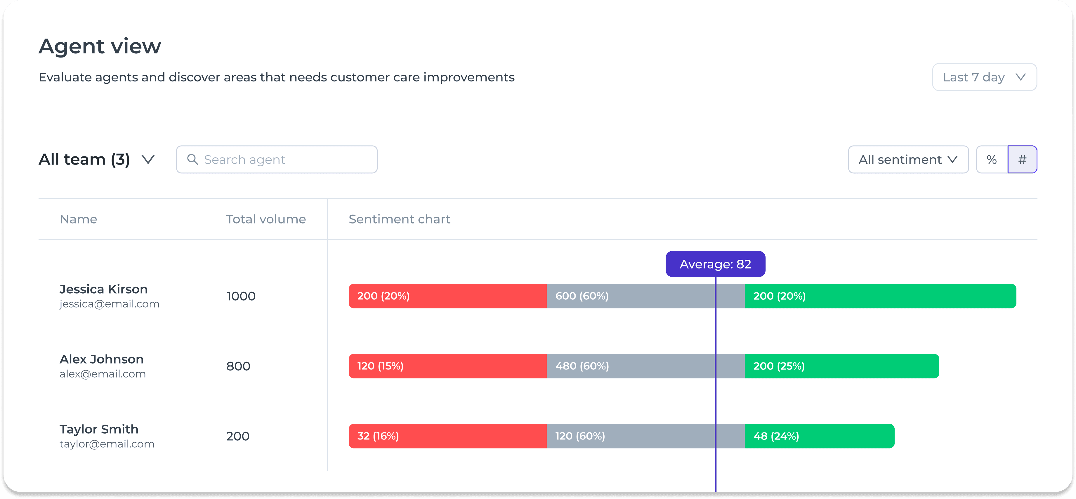 Monitor sentiment distribution by an agent or team for improved management efficiency.